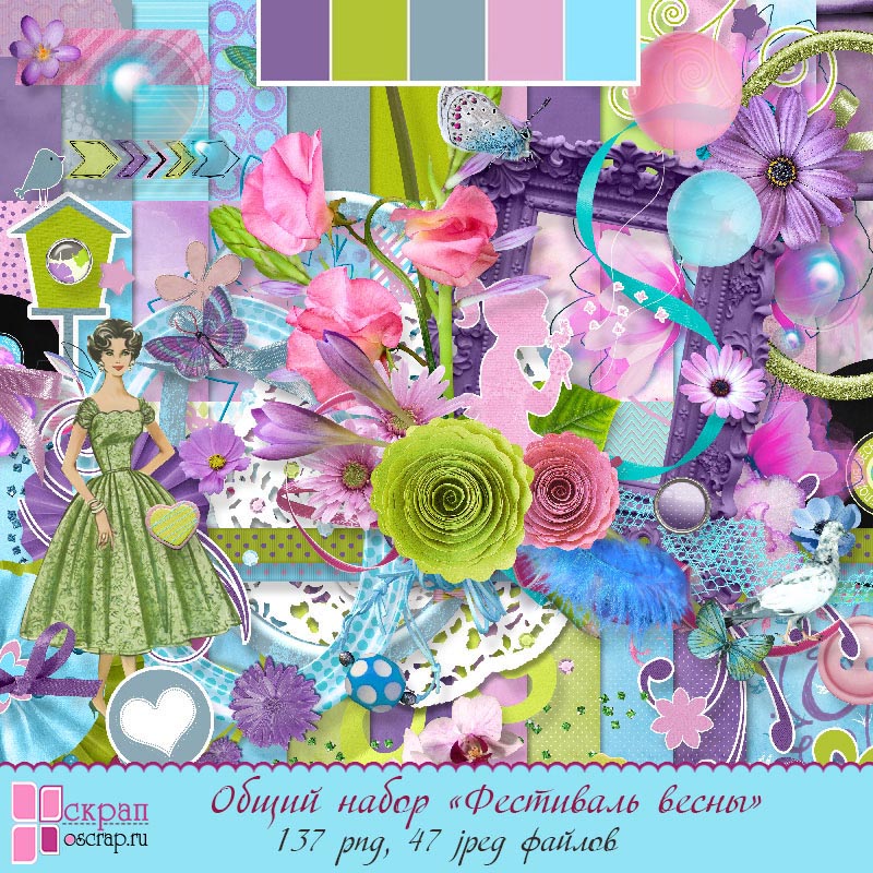 Две недели назад вы, наши дорогие друзья, помогли нам выбрать цветовую палитру для нашего общего скрап-набора, который получил название "Фестиваль весны". И вот работа над новым весенним набором закончена. Набор получился ярким и по-настоящему весенним!