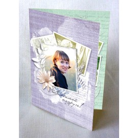 Печатается открытка на двухсторонней фотобумаге и сгибается в виде книжечки, ламинированная смотрится солиднее.